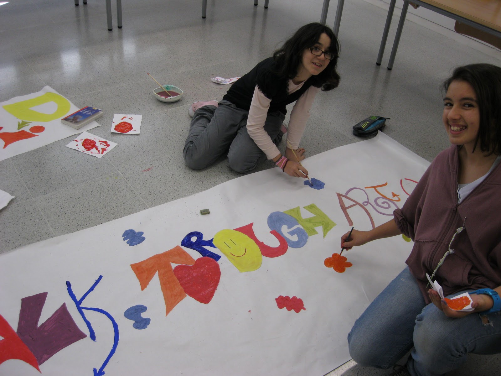 Uns altres companys i companyes a les comissions han fet cartells i han preparat les cadires al gimnàs per la jordada de portes obertes de demà.